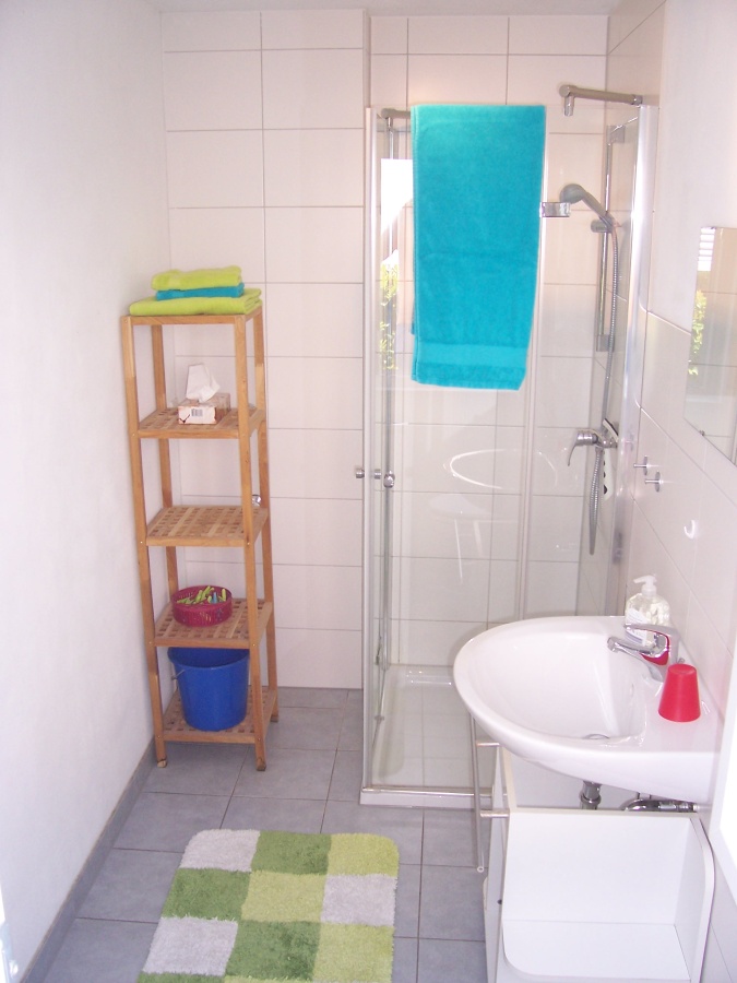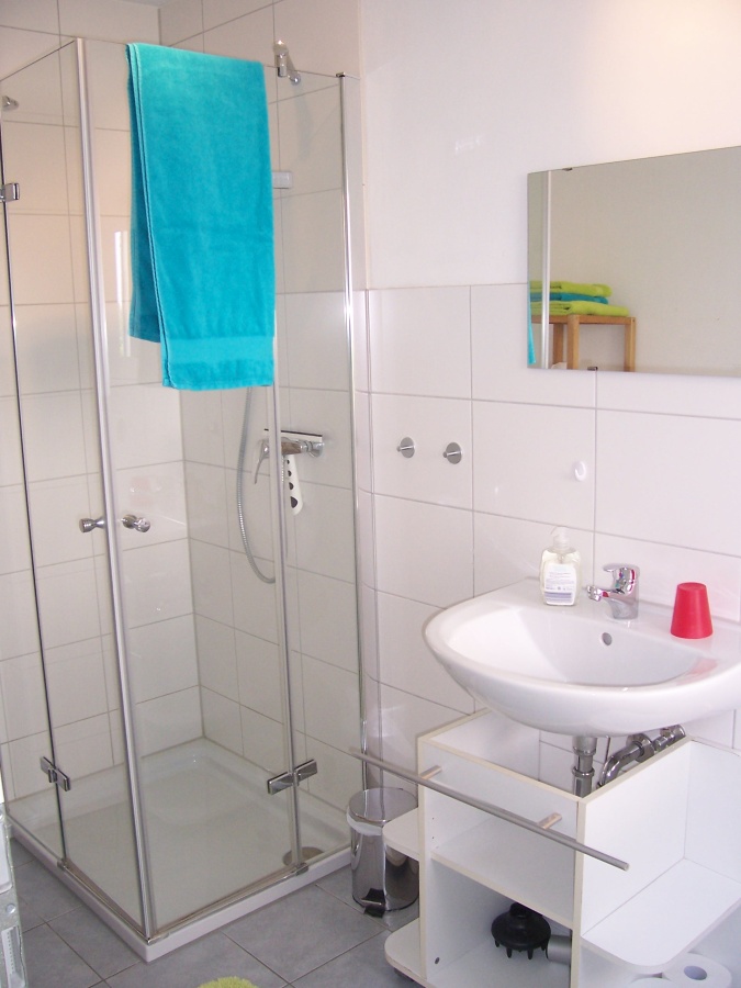 Das Badezimmer der Ferienwohnung ist mit einer Dusche, Waschbecken und WC ausgestattet.