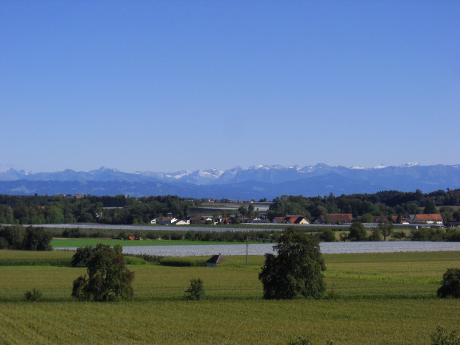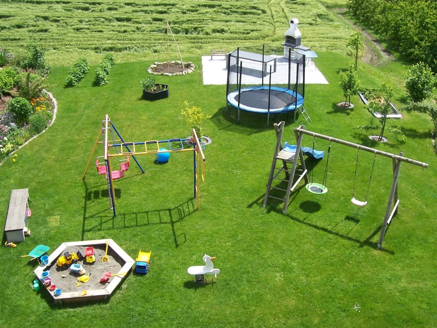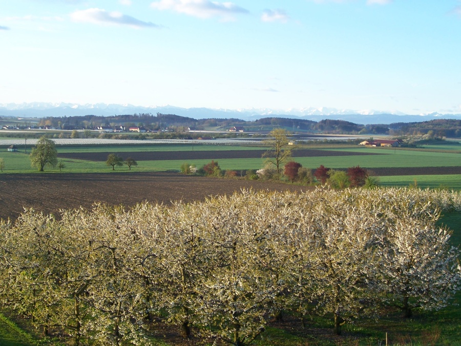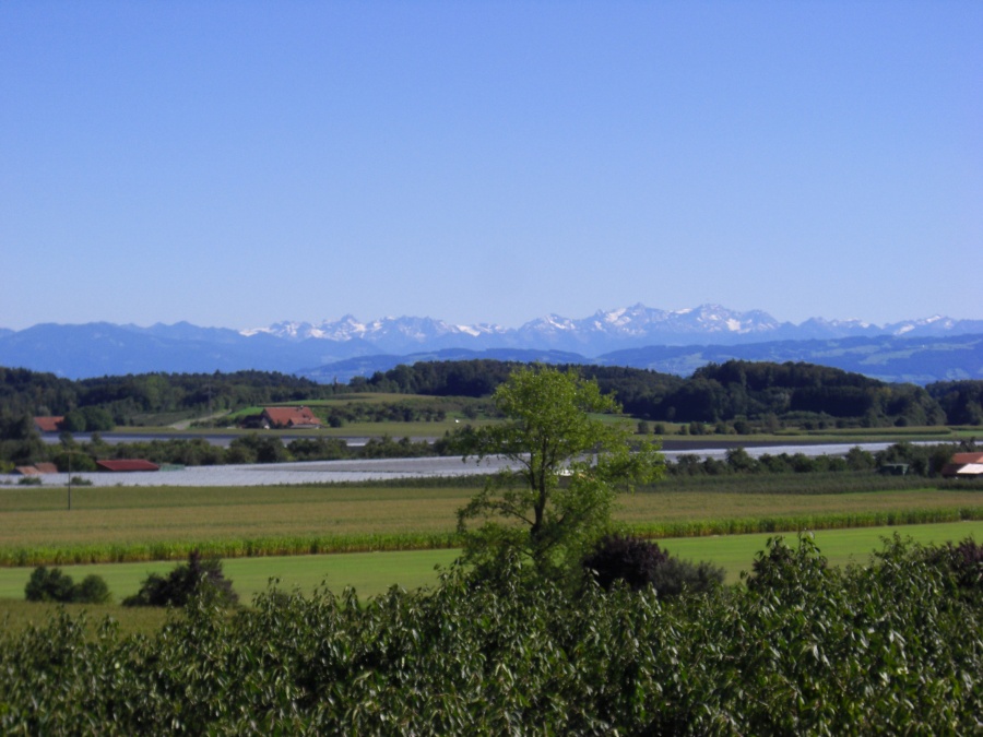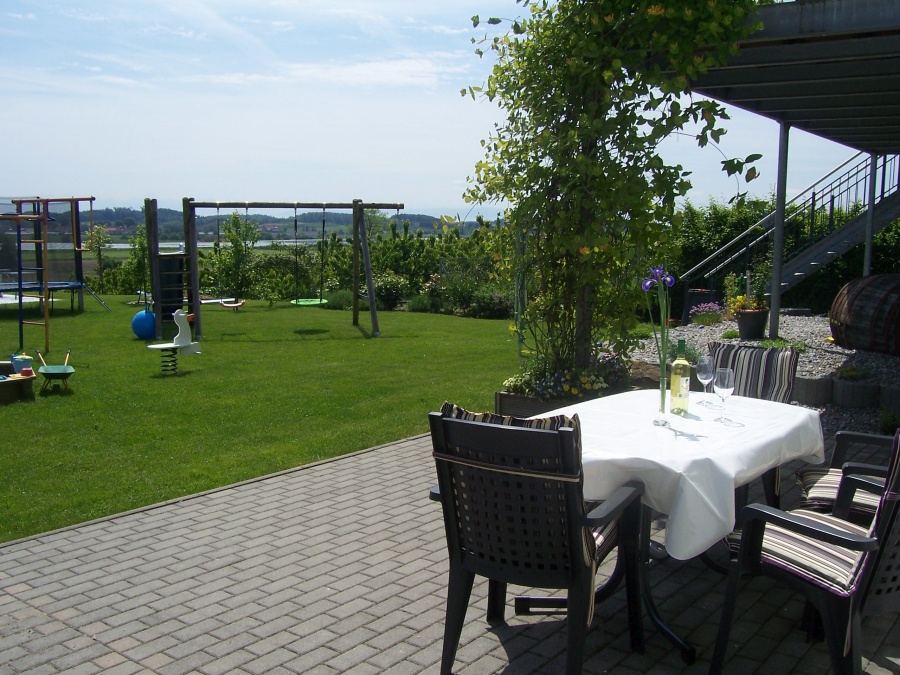 Auf der großen Terrasse können Sie auf gepolsterten Gartenstühlen bei herrlicher Aussicht auf die Alpen, grüne Wiesen und Obstbäume Ihr Frühstück genießen, den Tag bei einem Glas Wein ausklingen lassen oder einfach einen entspannten Urlaubstag verbringen.