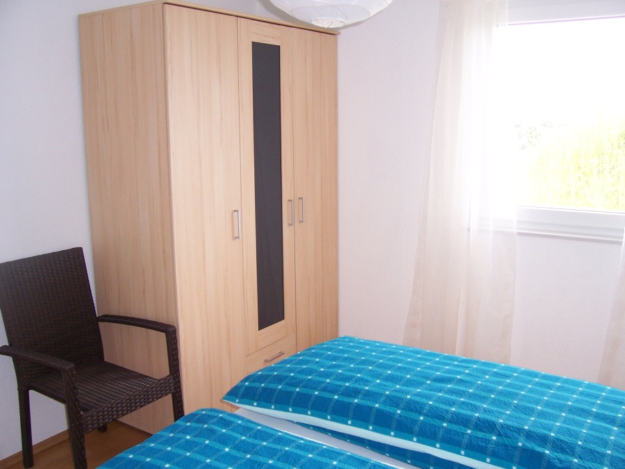 Im Schlafzimmer befinden sich ein großes Doppelbett sowie ein Kleiderschrank.