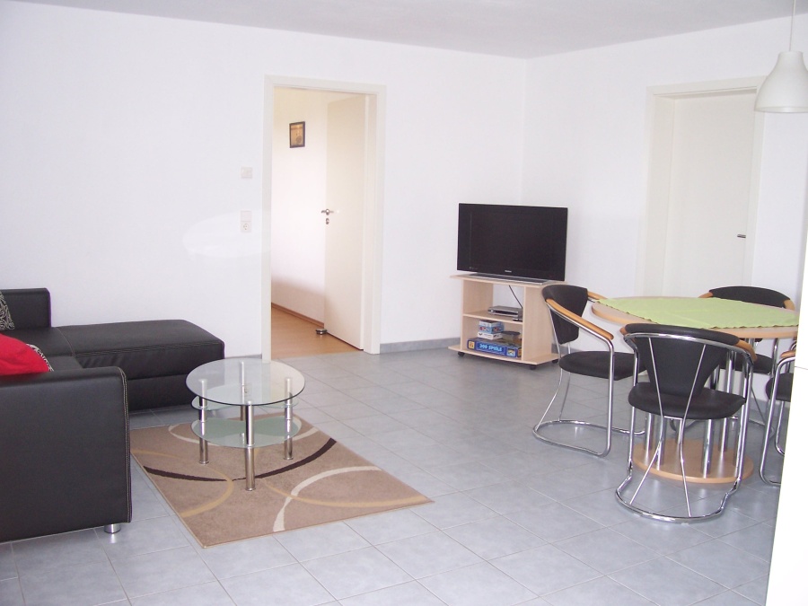 Das kombinierte Ess- und Wohnzimmer bietet ausreichend Wohnraum. Ein Fernseher mit Satellitenempfang ist vorhanden.