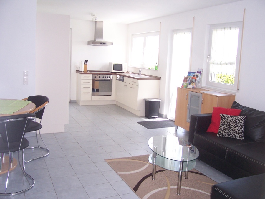 Durch die Tür zwischen Küche und Wohnbereich gelangen Sie auf die Terrasse und in den Garten.