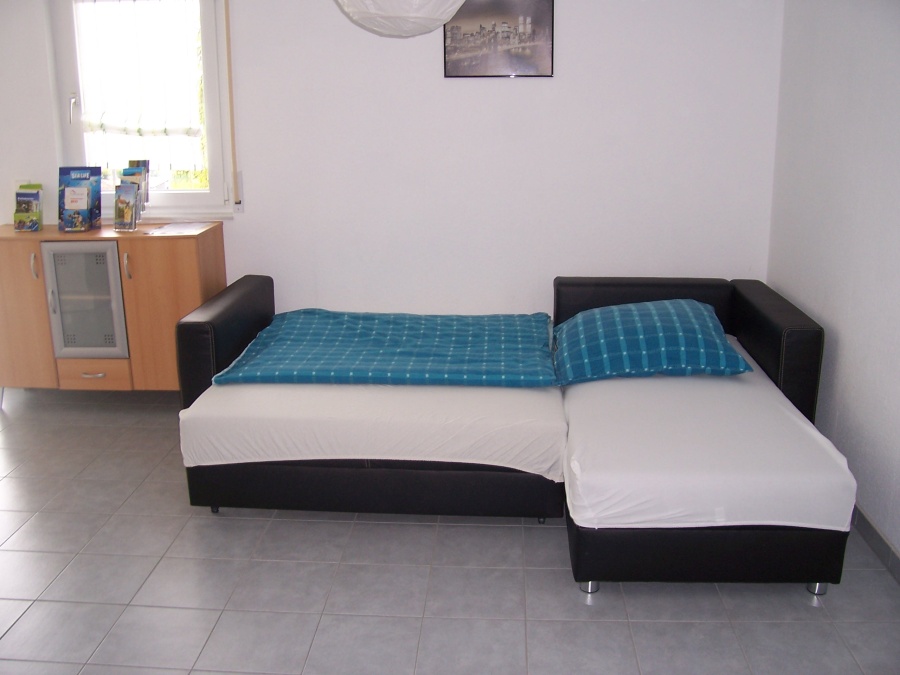 Das Sofa besitzt eine Schlaffunktion, so dass es bei Bedarf umgeklappt und als zusätzliches Bett genutzt werden kann.